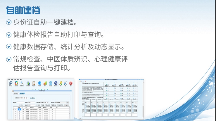 支持智能監(jiān)測設(shè)備接入,進行數(shù)據(jù)的長期追蹤、分析與評估。數(shù)據(jù)按及地方標準建立,內(nèi)置中醫(yī)體質(zhì)辨識,醫(yī)生可現(xiàn)場分析中醫(yī)體質(zhì)。